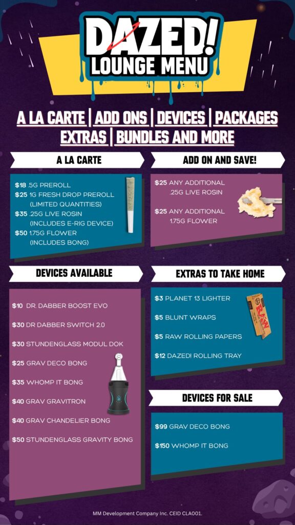 Experience the ultimate destination for cannabis enthusiasts at Dazed! Lounge, nestled within the Planet 13 Entertainment complex. With a massive dispensary, full service restaurant, and a variety of events and pop-ups, your journey into premium cannabis and entertainment begins here.